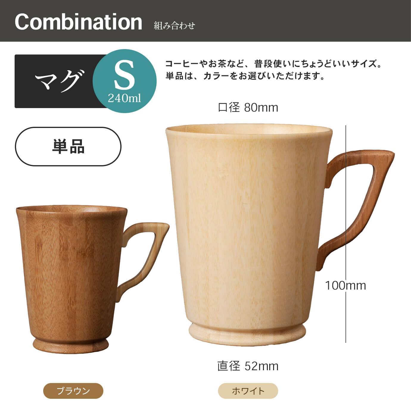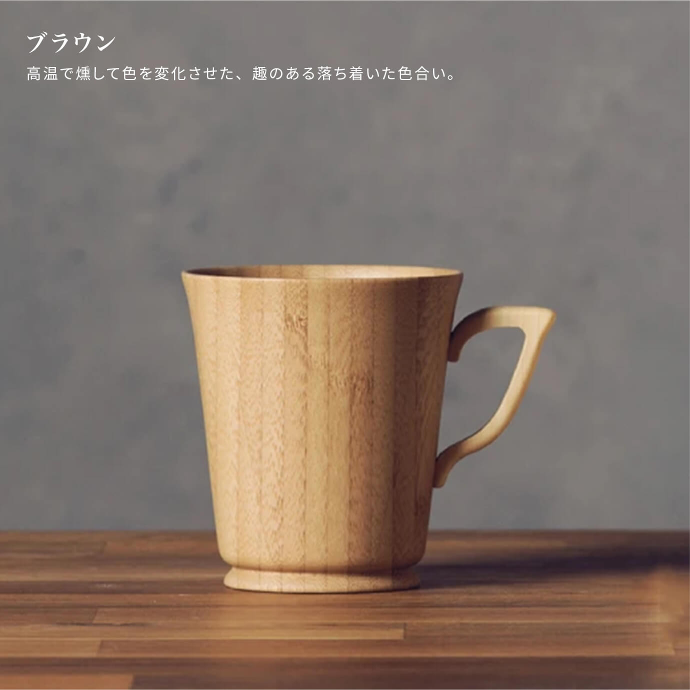 竹本来の色[ホワイト]をメインに使用し、取っ手部分には竹を燻すことで色を変化させたブラウンを配置。