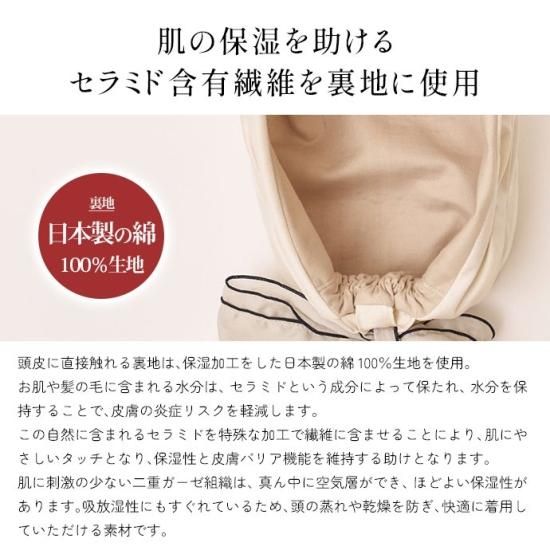 頭皮に直接触れる裏地は、保湿加工をした日本製の綿100%生地を使用。
