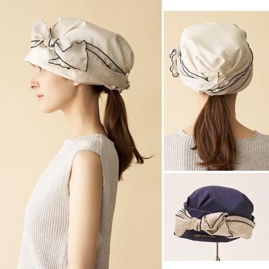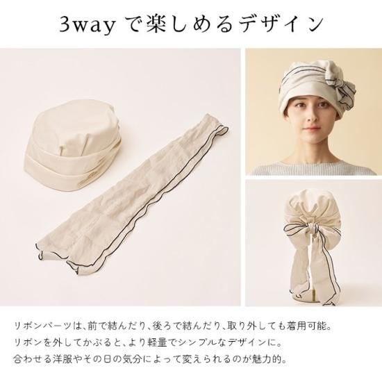 リボンを外してかぶると、より軽量でシンプルなデザインに。合わせる洋服やその日の気分によって変えられるのが魅力的。