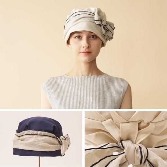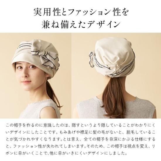 この帽子を作るのに意識したのは、隠すというより隠していることがわかりにくいデザインにしたことです。 もみあげや襟足に髪の毛がないと、脱毛していることが気づかれやすくなります。とは言え、全ての帽子を目深にかぶる仕様にすると、ファッション性が失われてしまいます。そのため、この帽子は視点を変え、リボンに目がいくことで、他に目がいきにくいデザインにしました。