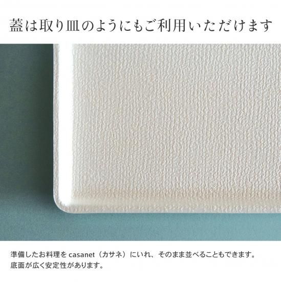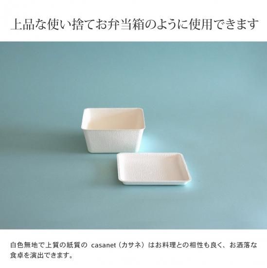 ・上品な使い捨てお弁当箱のように使用できます。白色無地で上質の紙質のcasanet (カサネ)はお料理との相性も良く、お洒落な食卓を演出できます。